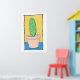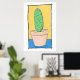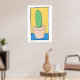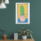 This poster has a simple composition, hand drawn using pens and watercolour, of a single lobed cactus in a flower pot. The background is yellow and blue, the pot is pinky beige and the cactus is very green and spiky, all contained within a thin black border, with a white surround. It's a charming example of simple, naive, art.
