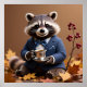 Stylish raccoon in a blazer holding a stolen espresso cup. Whimsical autumn animal art for adult humor and coffee lovers.
