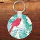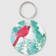 This image is designed with a red cardinal sitting on a snow covered branch of a pine tree. The cardinal is sitting and watching as snow flakes fall from the sky. The ground is covered with snow. This keychain will be a great piece to own or to give as a gift.
