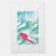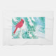 This towel is designed with a red cardinal sitting on a snow covered branch of a pine tree. The cardinal is sitting and watching as snow flakes fall from the sky. The ground is covered with snow.