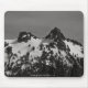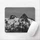A black and white photograph of two peaks in the Tatoosh Range known as The Castle and The Pinnacle. The mountain range is covered in snow despite it being summer. There are trees and stone scattered about the landscape and mountains. The sun's position allows for shadows to be cast on the mountain. Incognito clouds grace the sky. Image Copyright ©2023 Kimberly J Tilley. zazzle.com/store/developingnature
