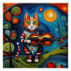 A.I. created print of a standing musician cat in vibrant clothes playing a fiddle amidst a surreal landscape with swirling trees and a radiant sun.