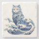 Elegant blue and white cat in the style of “The Wave Off Kanagawa” by the Japanese woodblock ukiyo-e artist Hokusai, especially for cat lovers.