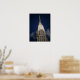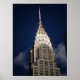 An iconic image of the top of the Chrysler Building which is one of the most famous skyscrapers in New York City. The sun illuminates the architectural details of the top of this skyscraper.