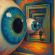 “The Corridor of Seeing” - A Surreal Portrait. A vast mirrored corridor extends into eternity, each segment holding an enormous watchful eye. At its centre, a man stands motionless not seeing his own reflection, lost in the infinite gaze. The stylised painting balances warmth and coolness, distance and intimacy, in a meditation on perception, time, and the quiet confrontation between self and infinity.