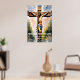 Jesus with long wavy hair and a beard, looking upwards with a contemplative expression. He has a wound on his forehead, and there's a red mark resembling a cross on his skin. He is wearing a white cloth draped over his shoulders, and a chain necklace is visible around his neck. The background showcases a wooden cross with red ropes, and the sky above is cloudy.