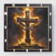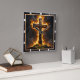 This incredibly powerful and inspiring design captures the theme of Divine Strength through unwavering faith. The artwork features a massive, dark Cross with a detailed central medallion, standing firmly on a rocky base and dramatically enveloped in brilliant, golden-orange flames and towering smoke clouds. A prominent clock motif with dark hands overlays the scene, reminding the observer of the eternal nature of this strength and the enduring power of faith. The design is presented with a high-quality, durable print that creates the striking illusion of a rich, dark wood grain frame surrounding the image, though this border is entirely a visual effect printed directly onto the clock face and is not a separate frame or real wood. The image contains the powerful Bible verse, "I can do all things through Christ who strengthens me. Philippians 4:13." This piece is a final, powerful reminder of Christian conviction.