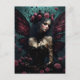 The fairy is dressed in black with pink and black butterfly wings wearing a crown of pink roses as she stands in the rose garden