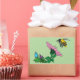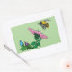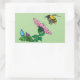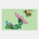 Two small flower bud sprites huddle together behind their mother as a large bee looms near. The parent flower sprite guards the little ones by presenting her fully bloomed flower to the insect.