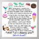 Don't EVEN get me started ... ; ) I never really had to seriously diet although I never could just eat everything. Now, I'm hearing, "Well, our bodies shift as we get older .... Once you pass a certain age, it's harder to lose weight ... blah blah blah." I do know several things I do wrong. One, I eat extremely late; yet, if I eat earlier, I go to sleep and get nothing done. So, what's with the theory that you shouldn't eat after a certain time? I figure I'm burning off all the calories before dinner. Oops, I don't eat all day, so yes, I know, my body is saying, "Store the fat. She's starving us." I could write a book here; yet, I will add that a major mistake I make is eating double dipped chocolate covered peanuts on the rare occasions I'm alone and want to read a mystery, so ... I can either give up those wonderful moments and reading ... or say, "Life's too short to not indulge every now and then!" (Of course, I go to sleep while eating them and reading ... and I can't begin to tell you what a mess that is ...."... SO .... Enjoy ! (Copyright 2009. Poetry: The Diet. Registered copyright held by author Sharon Rhea Ford. Any reproduction or resale will be a copyright violation under copyright law.) www.zazzle.com/sharonrhea* ... Please visit often .... Let's do lunch - giggle giggle ...