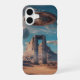 Set in an alien desert world, this **sci-fi digital landscape** artwork features a towering monolithic doorway framed by surreal rock formations and a sky filled with stars and planets. Colors like **copper**, **dusty blue**, and **peach-pink** define the environment, while the floating **UFO** and ringed **planet** add a futuristic, otherworldly vibe. The barren land, covered with small debris, suggests abandonment or ancient secrets. The large stone portal hints at interdimensional travel or lost civilizations. The scene feels cinematic and mysterious, blending science fiction with mythic architecture in a way that sparks the imagination.