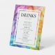 Introducing the Pedestal Sign with Drink Menu from the "Ethereal Bloom Collection," a stunning and functional addition to your wedding reception. This elegant sign features mesmerising alcohol ink artwork in vibrant hues of blues, purples, reds, oranges, and greens, beautifully complemented by delicate double-exposed lilies. The artwork creates a sophisticated and artistic backdrop, setting a refined tone for your event.