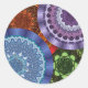 Water, fire, earth, and wind themed concentric circle mandalas come together in this colourful design. Each features a similar centre and outer layer with the others being appropriate to the element.
