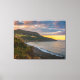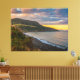 Experience the peaceful serenity of an Irish evening with this image capturing the beautiful Greystones Beach in County Wicklow, Ireland. As the sun sets, a dramatic golden and orange glow illuminates the horizon, contrasting with the moody clouds and dark headland known as Bray Head in the distance. The calm water reflects the vibrant sky, creating a tranquil scene along the pebble and sand coastline that offers a perfect, scenic escape from nearby Dublin.
