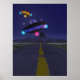 Close Encounters of the 3rd Kind type illustration with UFOs hovering over a long deserted highway