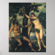 The Fall of Man; Adam and Eve (c. 1570) by Titian is a vintage Renaissance fine art religious portrait painting featuring Adam and Eve in the Garden of Eden. Eve is reaching for an apple from the tree of the knowledge of good and evil. A serpent (or snake) tempted Eve, who was aware of the prohibition against eating the forbidden fruit.