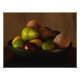 The design "The Famous Fruit Bowl" is a black bowl on a round mahogany filled with an assortment of fruits as pears, peaches, plums, golden apples, green apples and others with a neutral background photography print that I created in the studio. A wonderful kitchen and dining artwork for Zazzle's products.