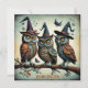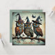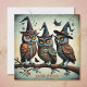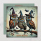 Scary but cute. A trio of owls wearing witch's hats; surreal style, an artificial-intelligence generated artwork, on a party invitation, for your Halloween pleasure.