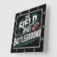 This black wall clock features the text "THE FIELD IS MY BATTLEGROUND" in a bold, stylised white font with green accents and a slightly distressed texture. Integrated into the design are graphics of a football and a cleated athletic shoe, suggesting a focus on American football. The overall design conveys a sense of intense competition and dedication to the sport.