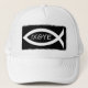 In Christian circles, the fish symbol is often used to symbolise the Saviour Jesus Christ. The dominant language of the early Church was Greek, and in Greek the phrase “Jesus Christ, Son of God, Saviour” produced the acronym ICHTHYS, the Greek word for fish. A Christian poem of the second century spells the word with the first letters of each line. Wear this hat to testify of your firm belief in Jesus Christ, Son of God, Saviour. The hat has a white fish on black with the acronym IXOYE inside. All of it has a white border.