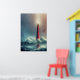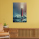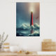 A red lighthouse is lighting with its light in the storm and rain that have flooded the small island rock it was standing on. This is a AI generated art.