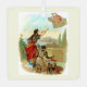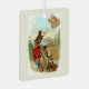 vintage painting illustration for a fairy tale by hans christian anderson with the sultan's daughter in vintage turkish clothing, long brown hair and bracelets is next to her servant who is preparing a meal, are at the top of a tower where the lady is waving at a man in the sky who is inside a flying trunk waving to her and dressed in orange dress.