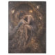 A woman with a flower crown sleeps peacefully inside a hollow tree trunk, surrounded by glowing fairies, a hanging lantern, and magical forest elements like mushrooms and moss.