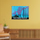 A restored version of the Forth Road Bridge poster. A colourful vintage train travel poster showing the bridge in twilight with passenger car lights visible crossing the bridge.