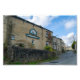 A daytime view of The Fountain Head Inn in Halifax, England, a traditional stone-built pub with multiple windows and a prominent sign displaying its name. The building appears weathered with some climbing plants on its facade, and a small paved area is in front of the entrance. This image can be edited and transferred to multiple products of your choosing.
