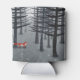 A lone wild red fox stands beneath the pine trees in a dark forest. For nature, wildlife and animal lovers.