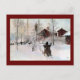 Vintage farm image in the winter with child in the snow, father working and their house and barn in the background.  Old-fashioned scene from Swedish artist Carl Larsson