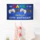 Cool gaming birthday party banner. Super fun and colourful featuring a blue pixel background, the text "THE GAME IS ON!", four video game controllers and the birthday childs name and age. This party accessory makes a cool little addition to a birthday party.