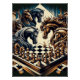 The design depicts a fascinating and imaginative chess scene in which horses with impressive manes and detailed armour are gathered over a chess board. The horses appear to be strategically involved in the game of chess, creating a strong symbolic connection to the knight in the game of chess. The style is a mix of vintage engraving and modern illustration with dynamic lines and dramatic colouring in shades of blue, gold and brown. The design conveys a mystical and strategic atmosphere, perfect for chess lovers and fantasy enthusiasts.