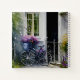 A bicycle stands near the door of a house in a summer garden. The bike is a simple, model with a basket on the front. The basket is filled with flowers, which are in full bloom. They create a beautiful and colourful display.