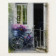 A bicycle stands near the door of a house in a summer garden. The bike is a simple, model with a basket on the front. The basket is filled with flowers, which are in full bloom. They create a beautiful and colourful display.