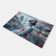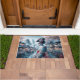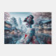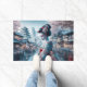 A beautiful traditional geisha posing in front of a landscape combining traditional and modern buildings.