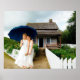 Two women stand in front of a rustic cottage, sharing a large blue umbrella. Their white dresses contrast with the lush greenery and overcast sky. This was done with the help of ai