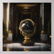 A striking vision of opulence and control, The Gilded Axis of Power features a polished obsidian sphere veined with gold, suspended in an ornate golden armillary form. Set within a grand classical hall of black marble and gold accents, the artwork symbolizes authority, destiny, and cosmic balance.