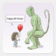 The girl says happy birthday to her friend the big green goblin.