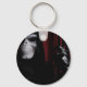 A masked skull worn with a black hooded cape and a black gloved hand inviting you to come. A maroon curtain is used as a backdrop in this photo. This is available on assorted styles and sizes of keychains.
