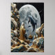 A man in a golden robe stands on a swirling, marble-like shore, gazing out at a large, glowing moon. A dolphin leaps towards him, while other smaller dolphins swim nearby. A small fishing boat floats in the water, suggesting the mans catch.