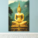 This image captures the reverence and grandeur of Thai Buddhist art. The Gilded Buddha is depicted in a deep meditative posture (Dhyana Mudra), radiating calm and light against a dramatic backdrop of the Thailand deep green jungle foliage and soaring, mist-shrouded limestone peaks. The rich gold of the statue, complete with the iconic spire (Ushnisha), offers a vibrant contrast to the natural, verdant landscape.