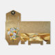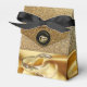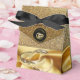 A luxurious shimmering gold silk texture draped through two wedding rings on a dramatic black background with a Deco style stripe to give the design a chic and glamourous look for a wedding thank you favour box