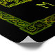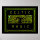 Surrounded by a border of Celtic knots, a stylised, mystical forest and riders in tones of green.
