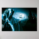 This image depicts a skeletal figure, likely the Grim Reaper, cloaked in a hooded robe. The figure stands in a dark, eerie graveyard, illuminated by the glow of a full moon. A skeletal hand, holding a skull, emerges from the ground. The overall atmosphere is one of death, mystery, and the macabre. The color palette is predominantly blue, creating a cold, unsettling mood.