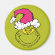 This fantastic, bold illustration is a close-up portrait of the Grinch in full mischievous mode! He has his signature sly grin and bright yellow eyes, but his look is updated with a large, fluffy Santa hat in a fun, unexpected pink/fuchsia color instead of the traditional red. This graphic is perfect for anyone who loves the holidays but embraces a non-traditional, delightfully grumpy, and colorful style!