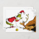 This hilarious illustration captures the precise moment the Grinch decides his dog needs an upgrade! The Grinch, dressed in his full, fuzzy Santa suit, is meticulously tying a single reindeer antler onto the head of his dog, Max, using a piece of string or yarn. Poor Max looks utterly resigned to his fate as the "reluctant reindeer." This fun, classic illustration perfectly highlights the absurd and mischievous planning behind the famous Christmas heist!