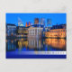 Postcard of the skyline of the Hague city, the government centre of the Netherlands, at the beginning of the evening at Blue Hour with the modern architecture skyscrapers behind historic Mauritshuis museum, Binnenhof parliament building and Hofvijver lake with a white fading bar and the text: 'The Hague'.
