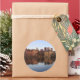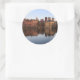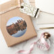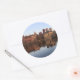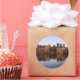 Round photo sticker with the modern skyline of the city centre of The Hague together with historic Mauritshuis museum and the seat of government Parliament building with reflection in the still water of Hofvijver lake at dusk in The Netherlands.