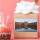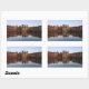 Rectangular photo sticker with the modern skyline of the city centre of The Hague together with historic Mauritshuis museum and the seat of government Parliament building with reflection in the still water of Hofvijver lake at dusk in The Netherlands.